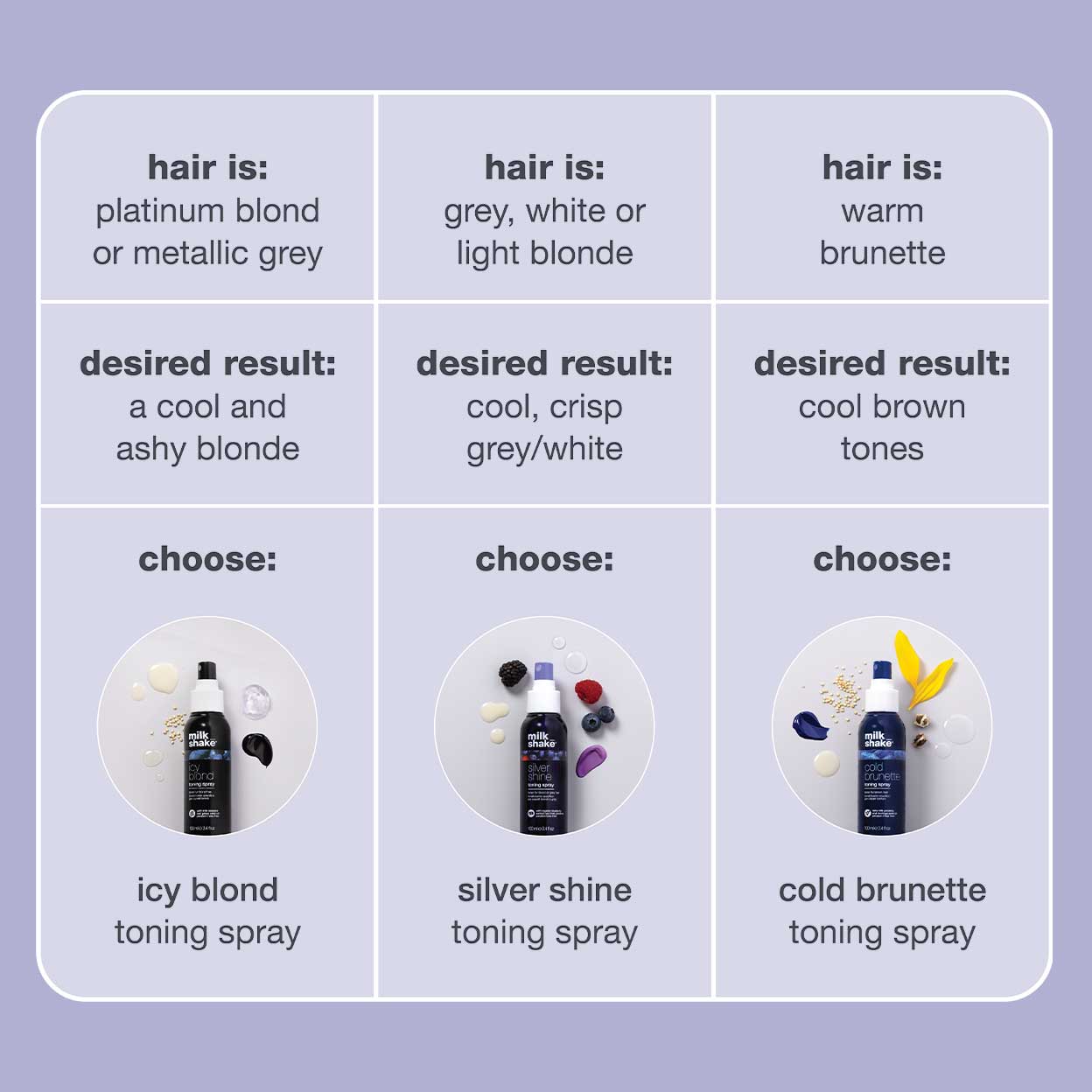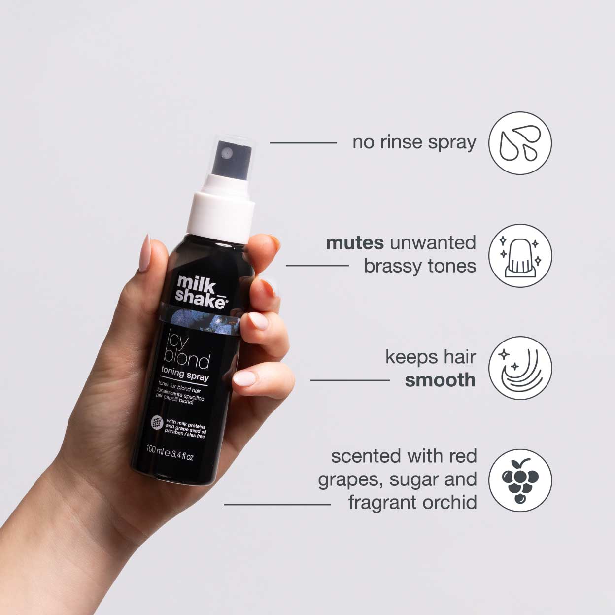 Spray nuantator pentru crearea tonurilor reci Icy Blond Toning Milk Shake 100ml - Este un produs esential pentru parul blond care combate eficient nuantele nedorite de galben si portocaliu lasand o reflexie gri-cenusie, adaugand profunzime si complexitate culorii parului tau.